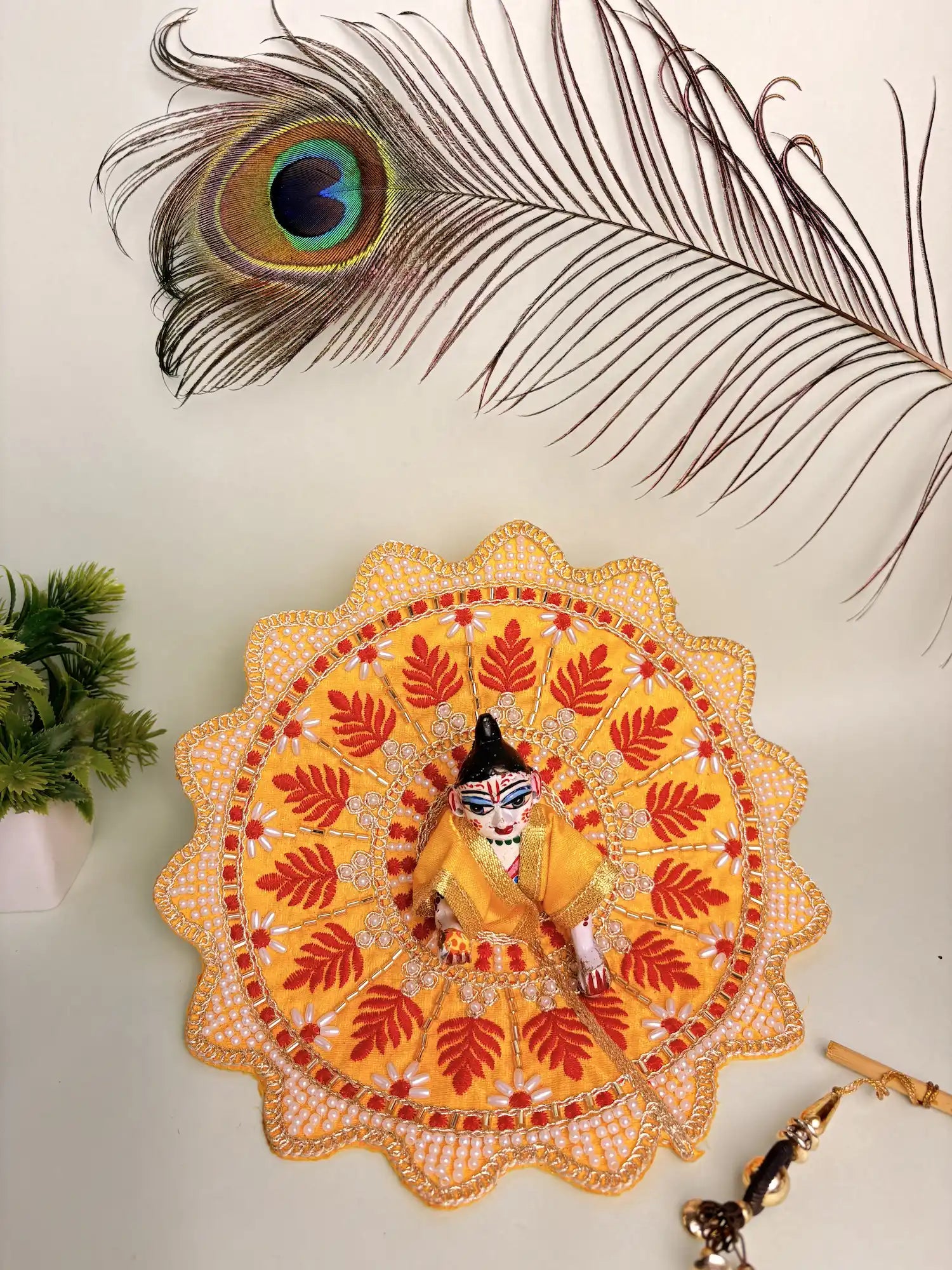 This sunny yellow poshak in size 4 brings vibrancy and divine energy to your Laddu Gopal Ji. Adorned with red leaf patterns and bordered with intricate lace, it’s a perfect expression of devotional love.