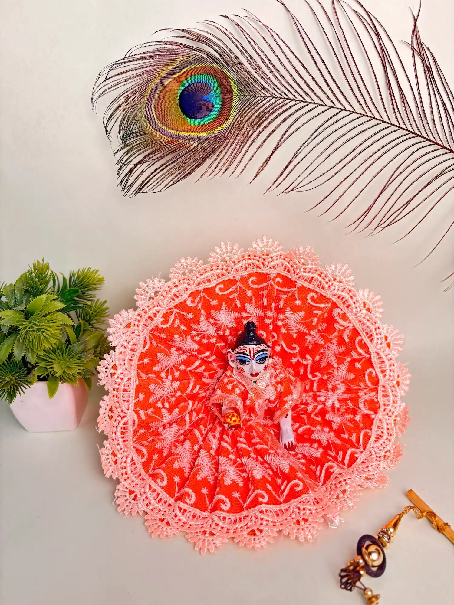 Infuse energy and tradition into your Krishna Ji’s appearance with this rich orange lace poshak. Designed in floral net fabric and finished with elegant lacework, this poshak is a striking combination of spirituality and celebration.